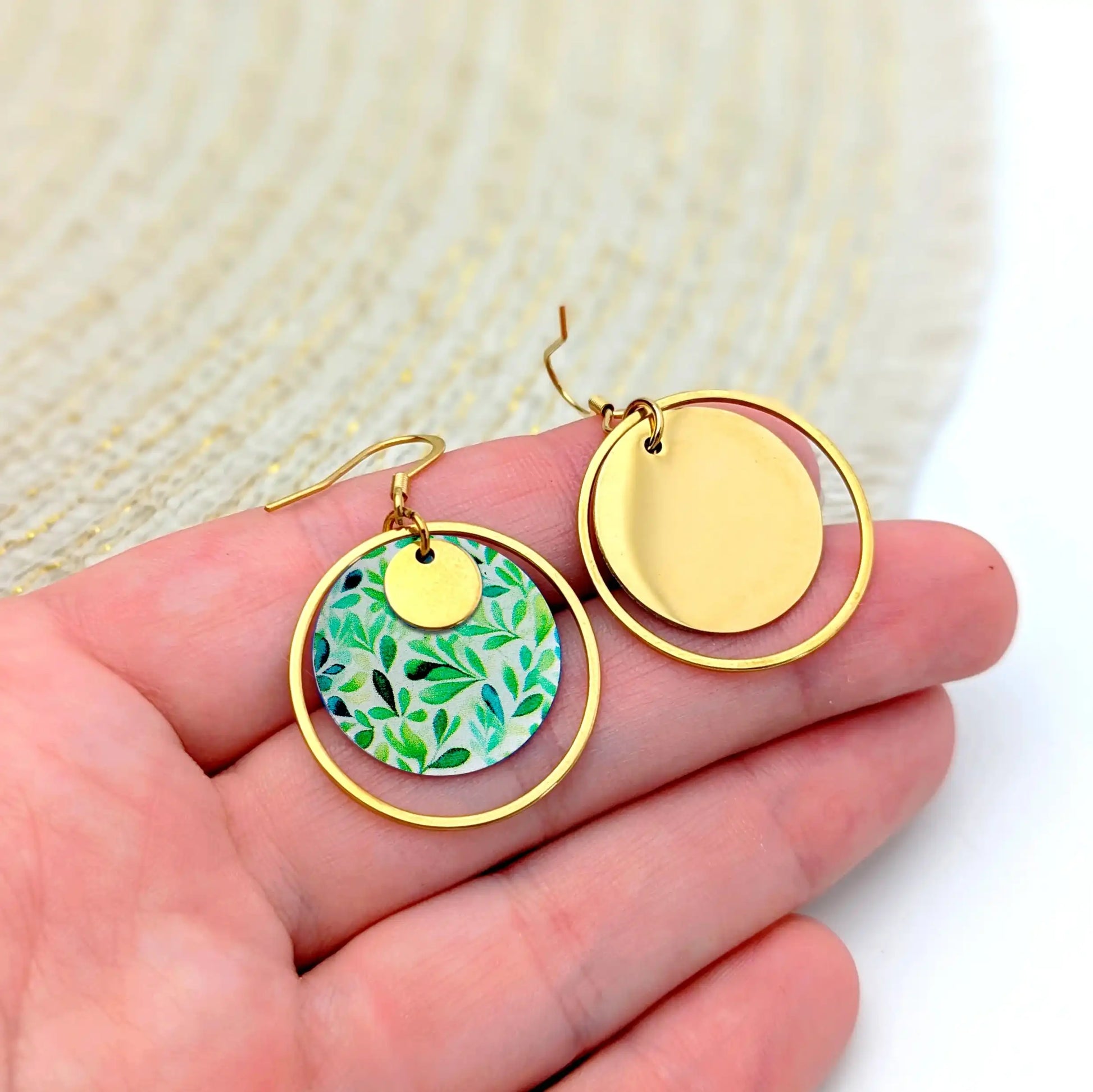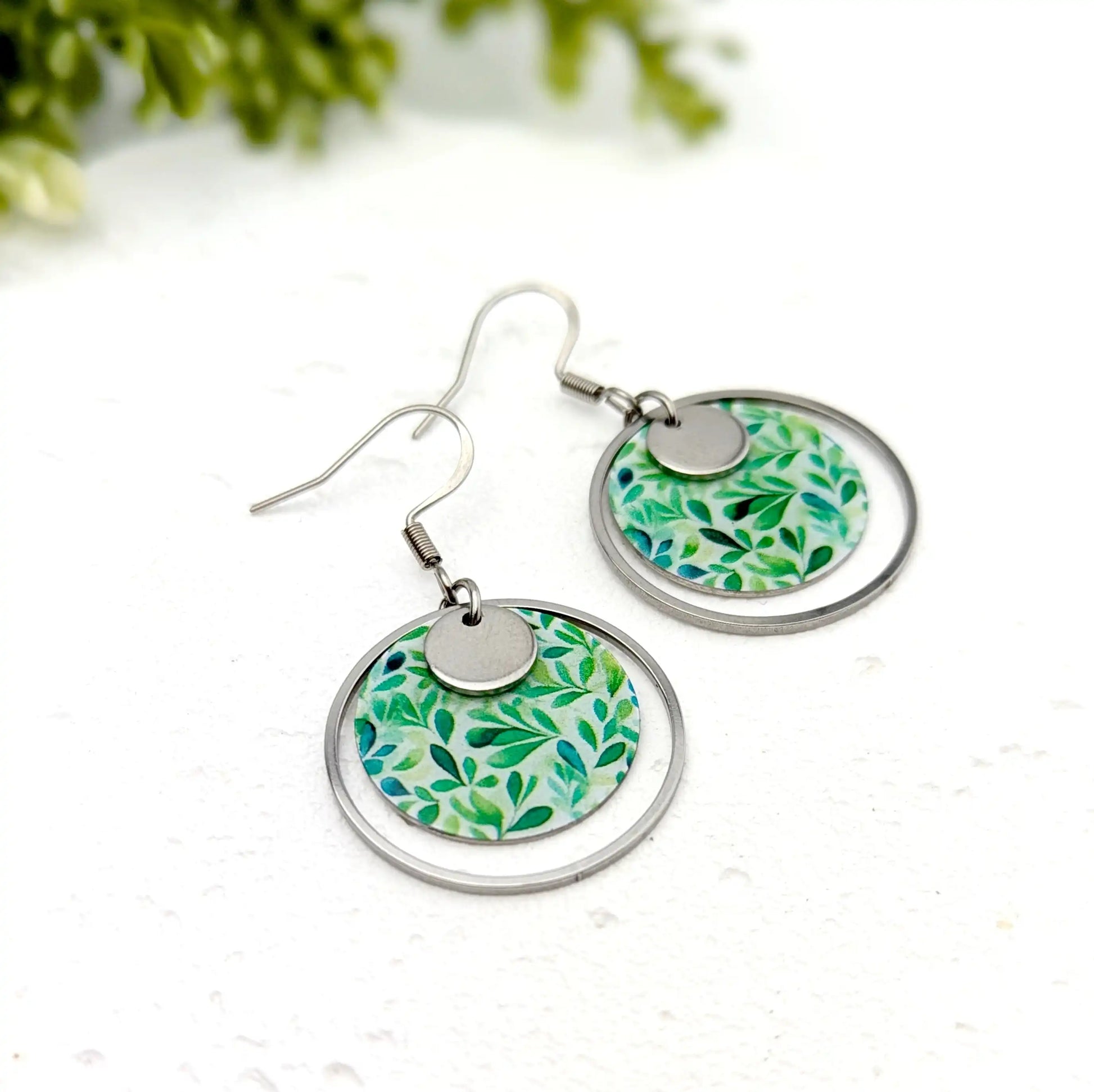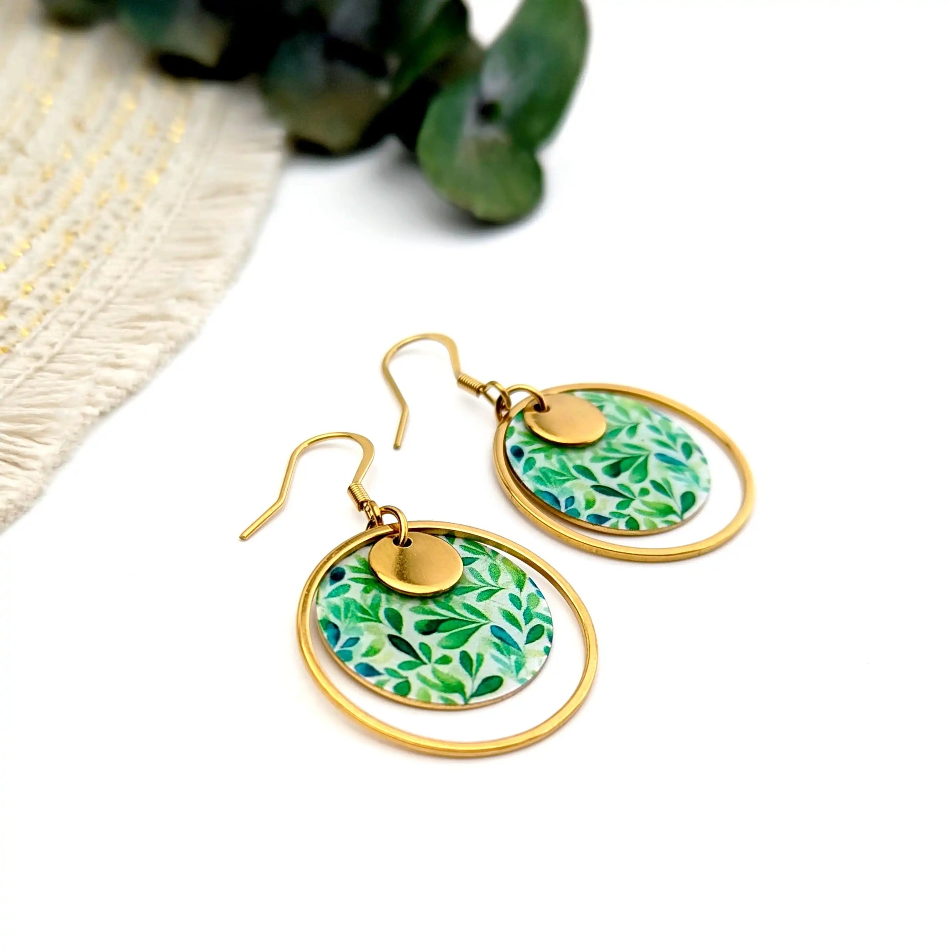 Boucles d’oreilles feuilles vertes en résine et acier inoxydable pour femme