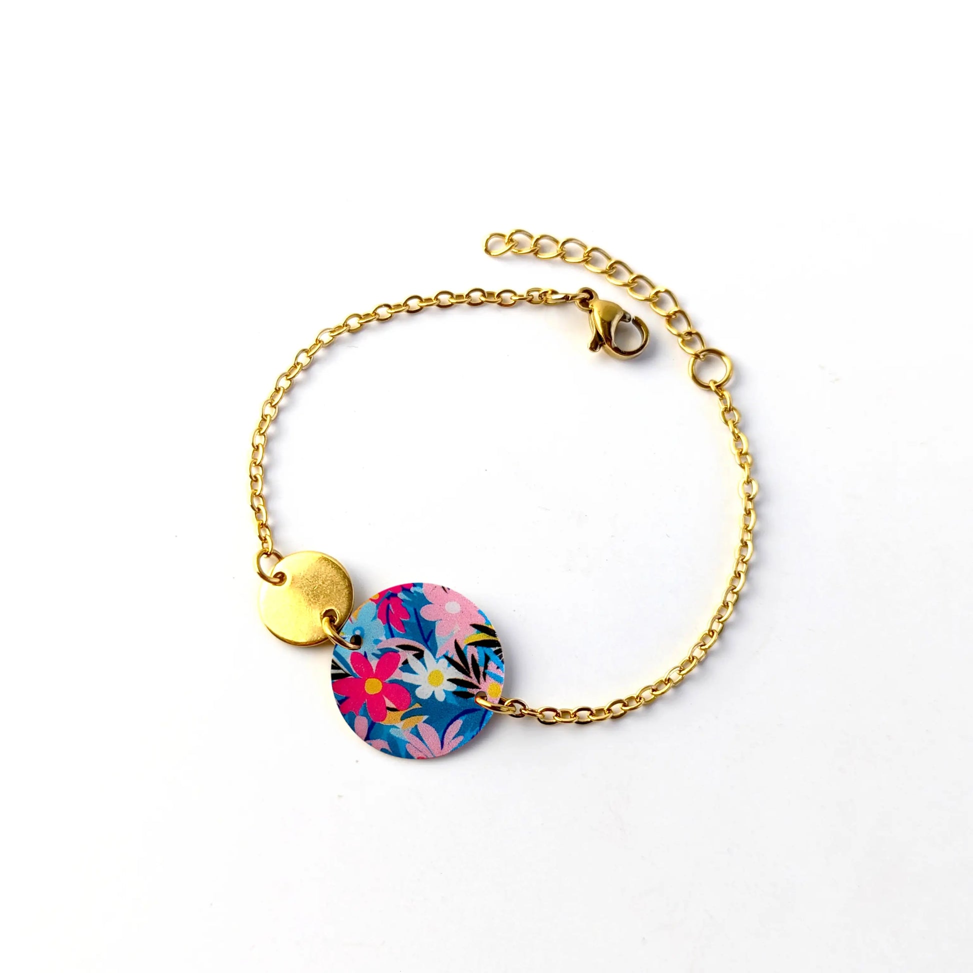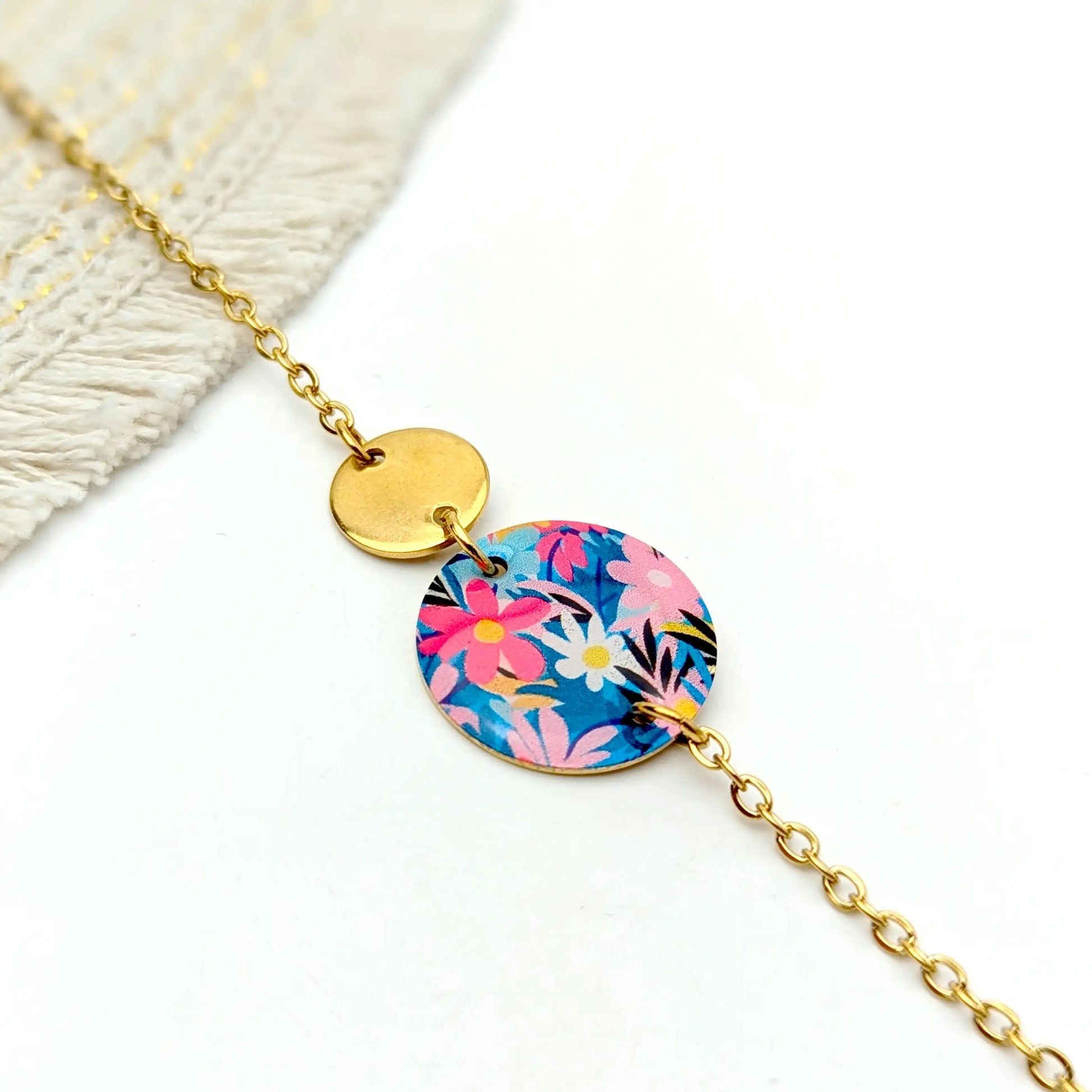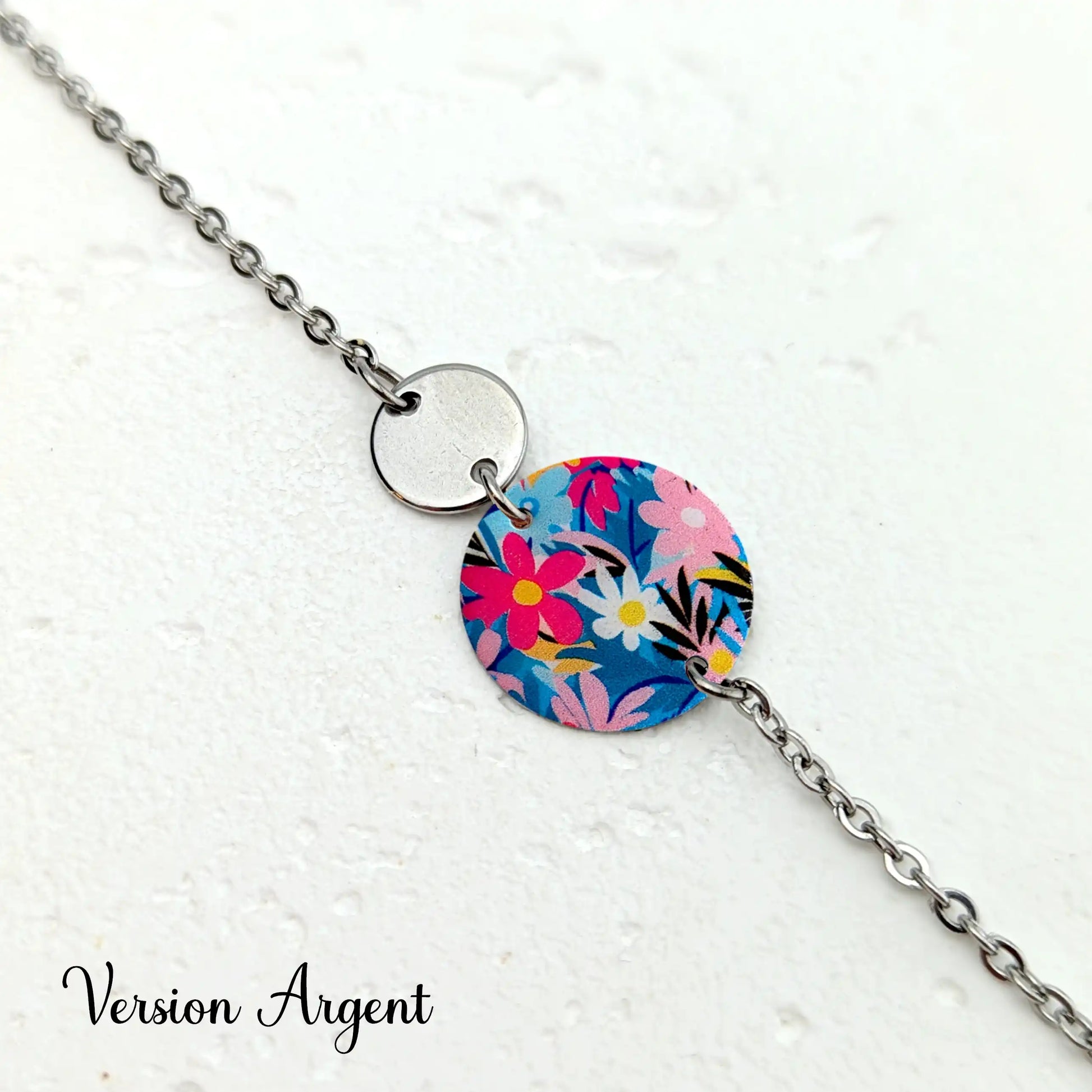 Bracelet fleurs rose et bleu en résine et acier inoxydable pour femme