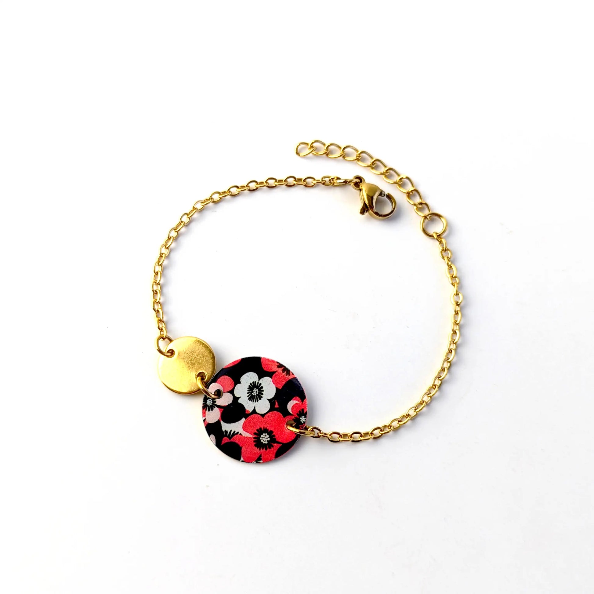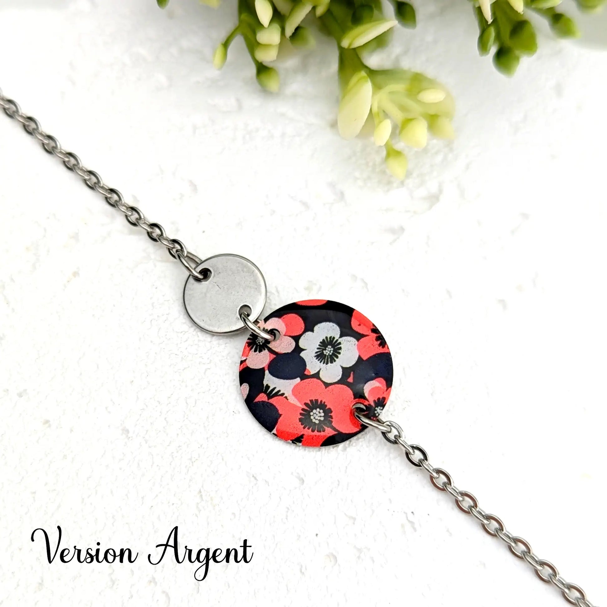 Bracelet fleurs rouge et noir en résine et acier inoxydable pour femme