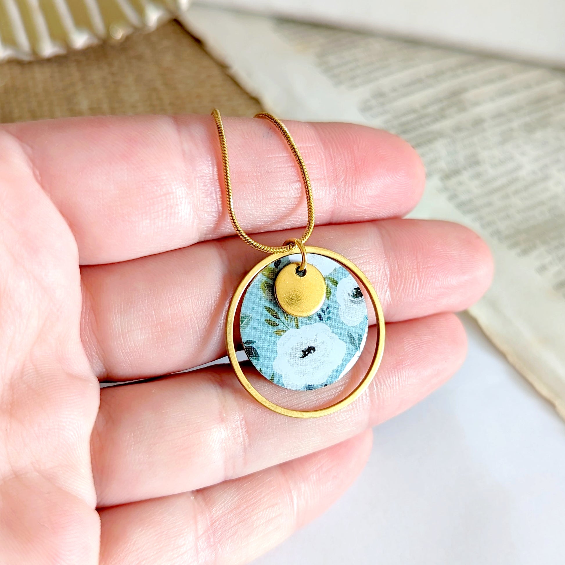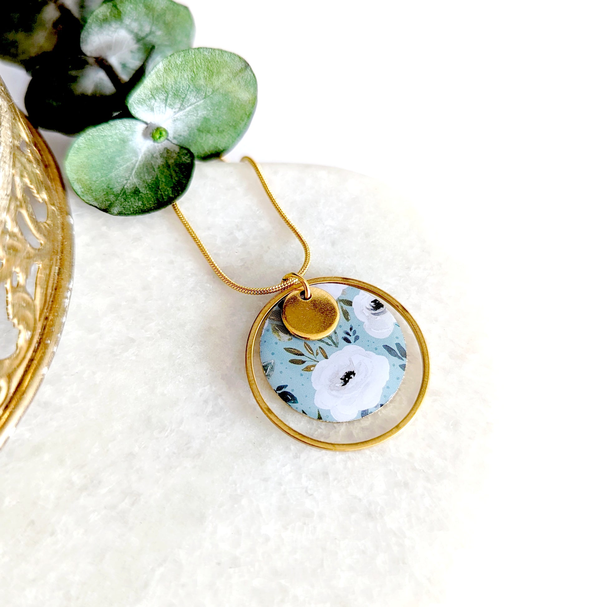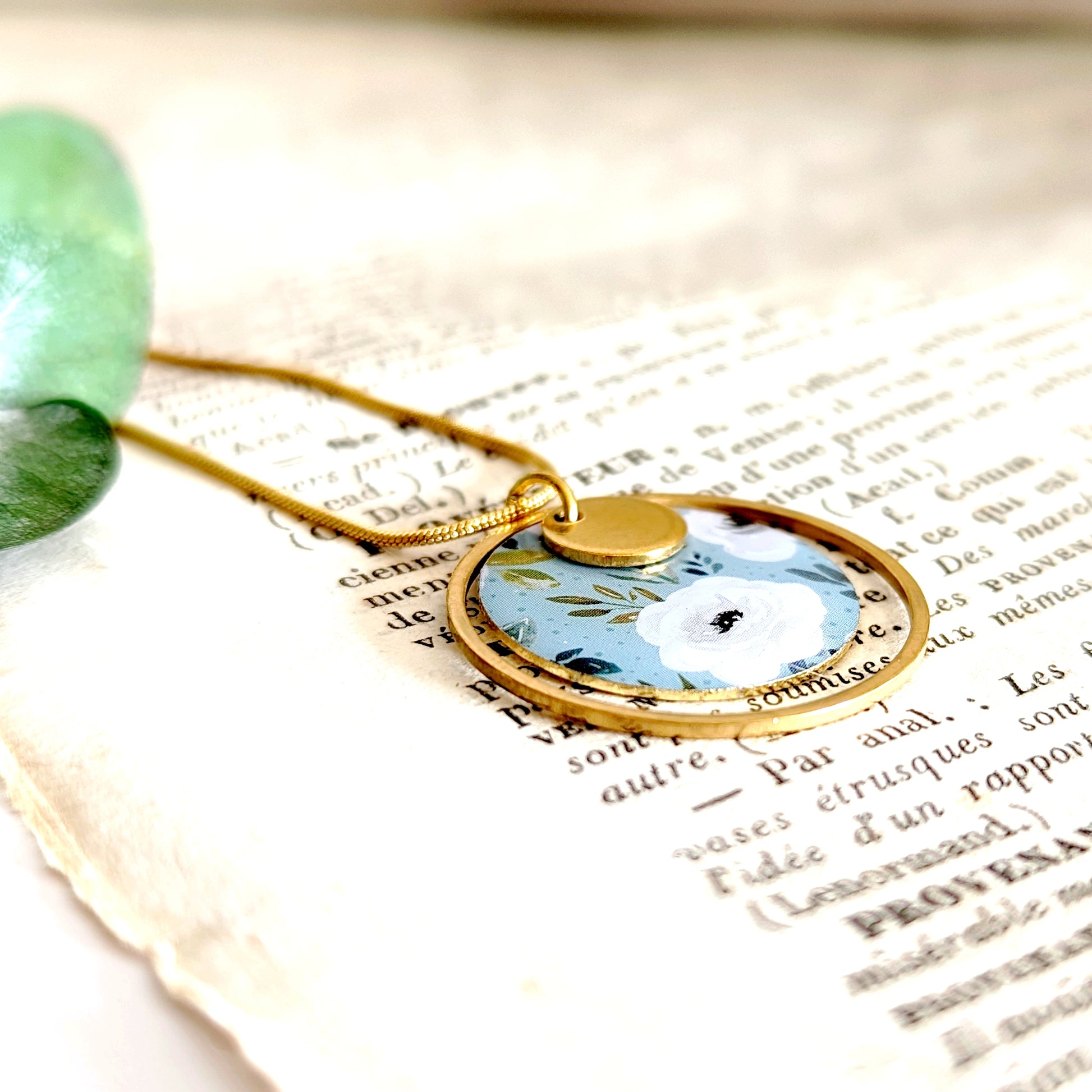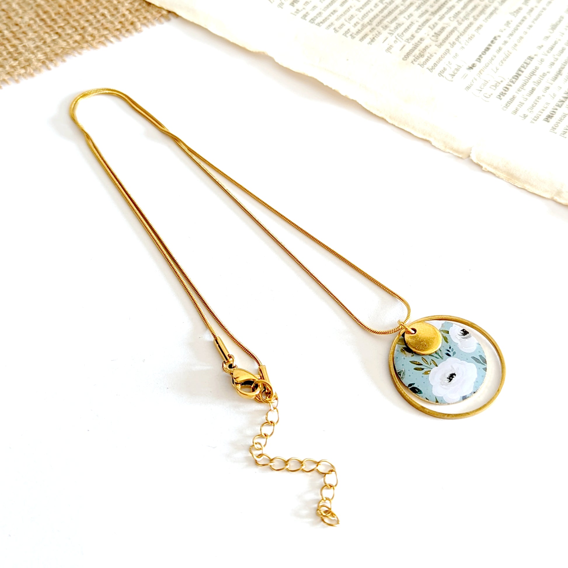 Collier pendentif Fleurs délicates blanches sur fond vert d'eau pour femme
